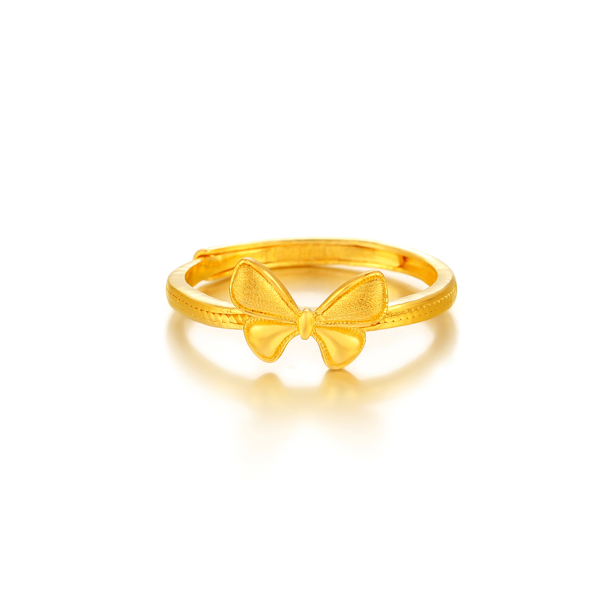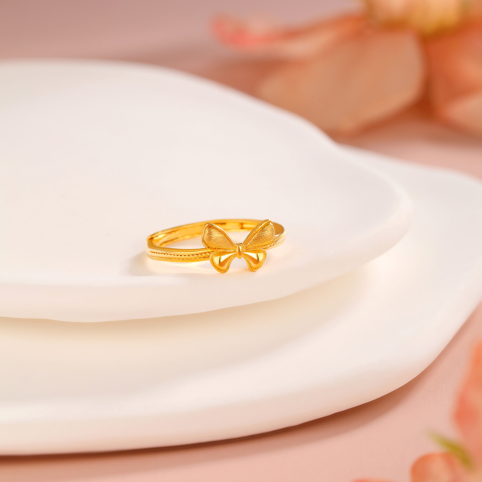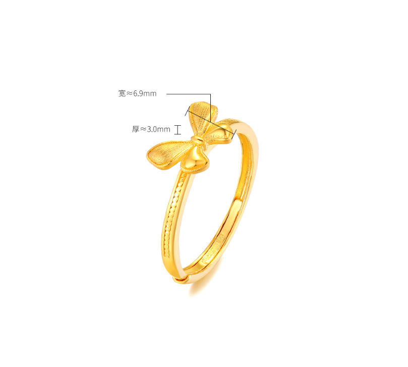 以立体蝴蝶结为形把少女的浪漫期许融化在指尖的就金光流转里拉丝工艺让金面泛起朦胧柔光像给蝴蝶结蒙上一层春日雾霭每一道褶皱、每一缕金芒都藏着对美好的向往是心动时的雀跃也是岁月里的小确幸承载所有关于爱的絮语成为指尖最温柔的注脚
