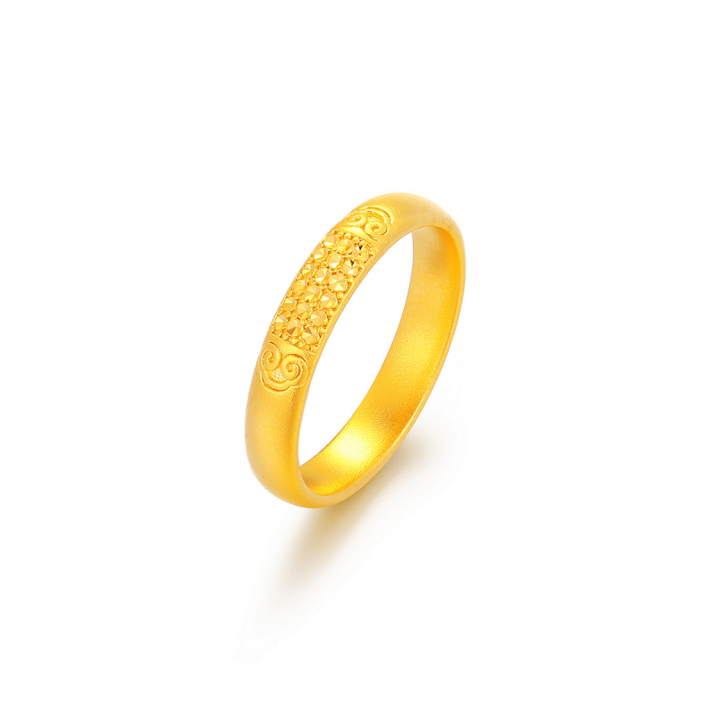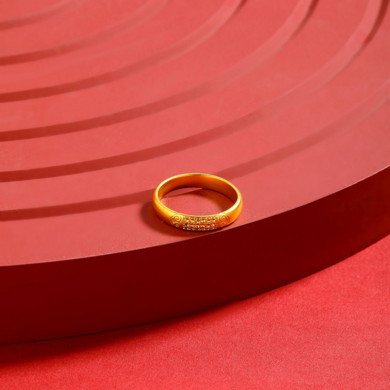 承古法金工打造哑光戒身表面饰以满铺仿钻点辅以点缀如意纹纹样细节金质的温润与纹样的雅致交织如意纹寓意万事顺遂、称心如意仿钻点折射细碎光泽简约造型适配日常佩戴是承载美好期许与东方质感的雅致指环