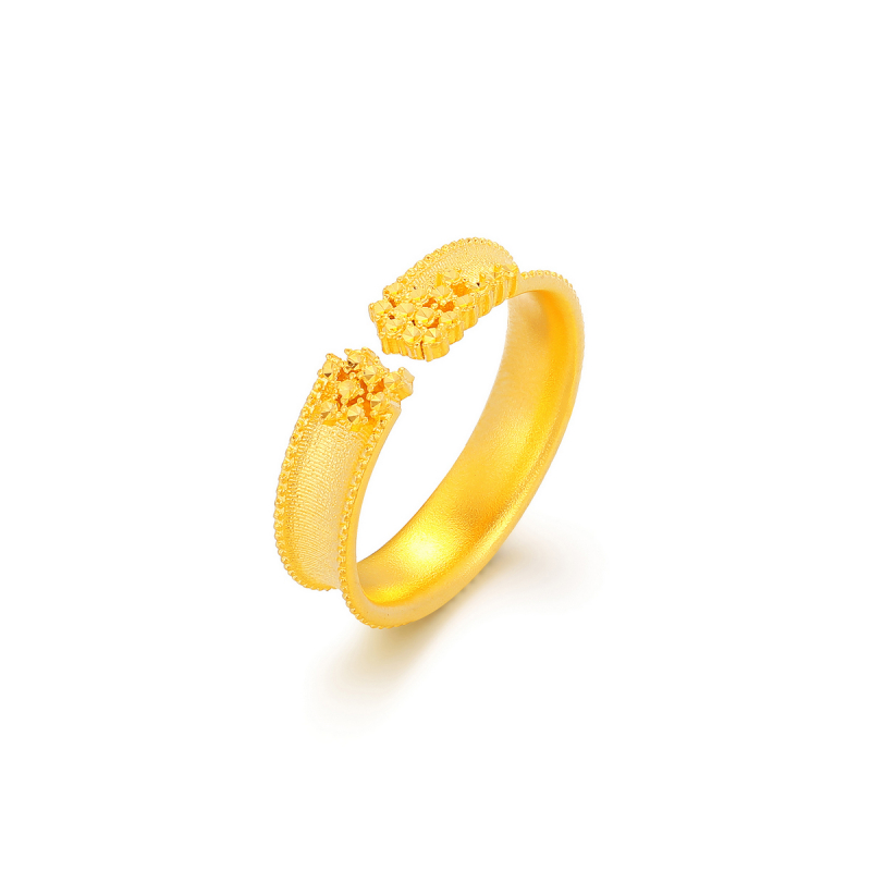 承古法金工打造哑光戒身 以仿钻点与钉珠点缀细节 金质的温润与纹理的精致交织 仿钻点折射细碎光泽 开口设计适配不同指围 简约造型适配日常佩戴 是兼具复古质感与时尚亮点的雅致指环