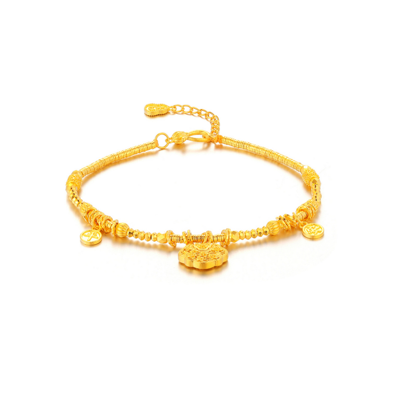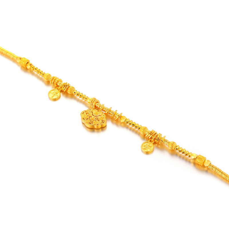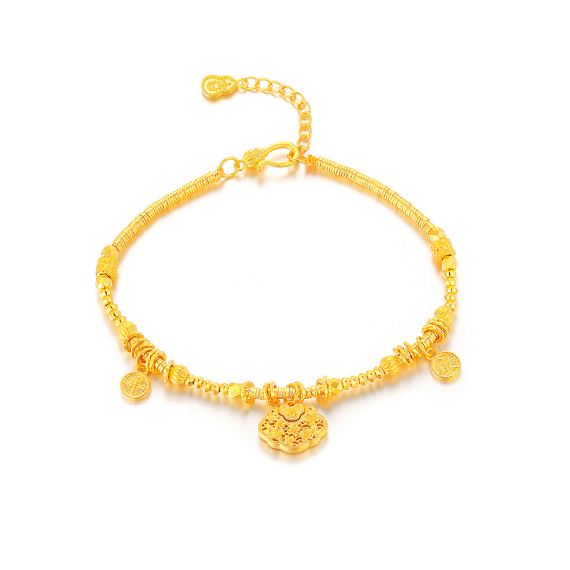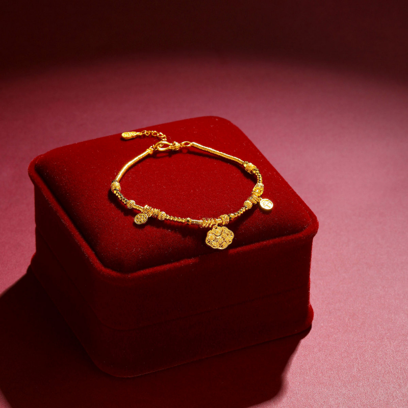 腕间的吉顺雅章 承古法匠艺,融周全祈意 以“花卉”“锁包”为核 织就腕间的温润信物 链身金珠与盘缠层叠,蕴含“富贵恒长”之喻 花卉饰件纹路精巧,衔“雅意丛生”的灵韵 锁包雕纹饱满,藏“平安喜乐、锁住吉运”的祈愿 足金光泽裹着雅致元素,尽显温润贵气 花卉的清雅、锁包的安稳、盘缠的丰裕交织 既是日常穿搭的雅致点缀 亦是腕间承载周全祈愿的信物 以器形载吉顺,以光韵织雅章 让平安喜乐随腕间流转,尽显含蓄贵气
