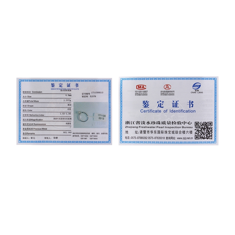 规格:约0.9克(含锆石)尺寸:12#开口,珍珠直径:5-5.5mm材质:925银、淡水珍珠、锆石证书:鉴定证书