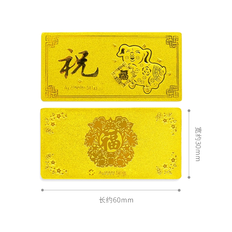 规格:50克尺寸:60mm*30mm*1.9mm材质:Au.9999证书:生产证书