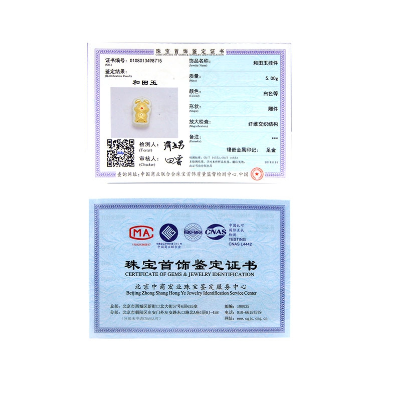尺寸:高:26mm 、宽:16mm材质:和田玉、足金证书:送检证书